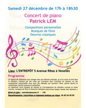Programme: Piano - Compositions, musiques de films (Hans Zimmer, James Horner, David Newman, ...), oeuvres classiques (Haendel, Bach, Mozart, Tchaikovsky, Chopin, Beethoven, ...)
